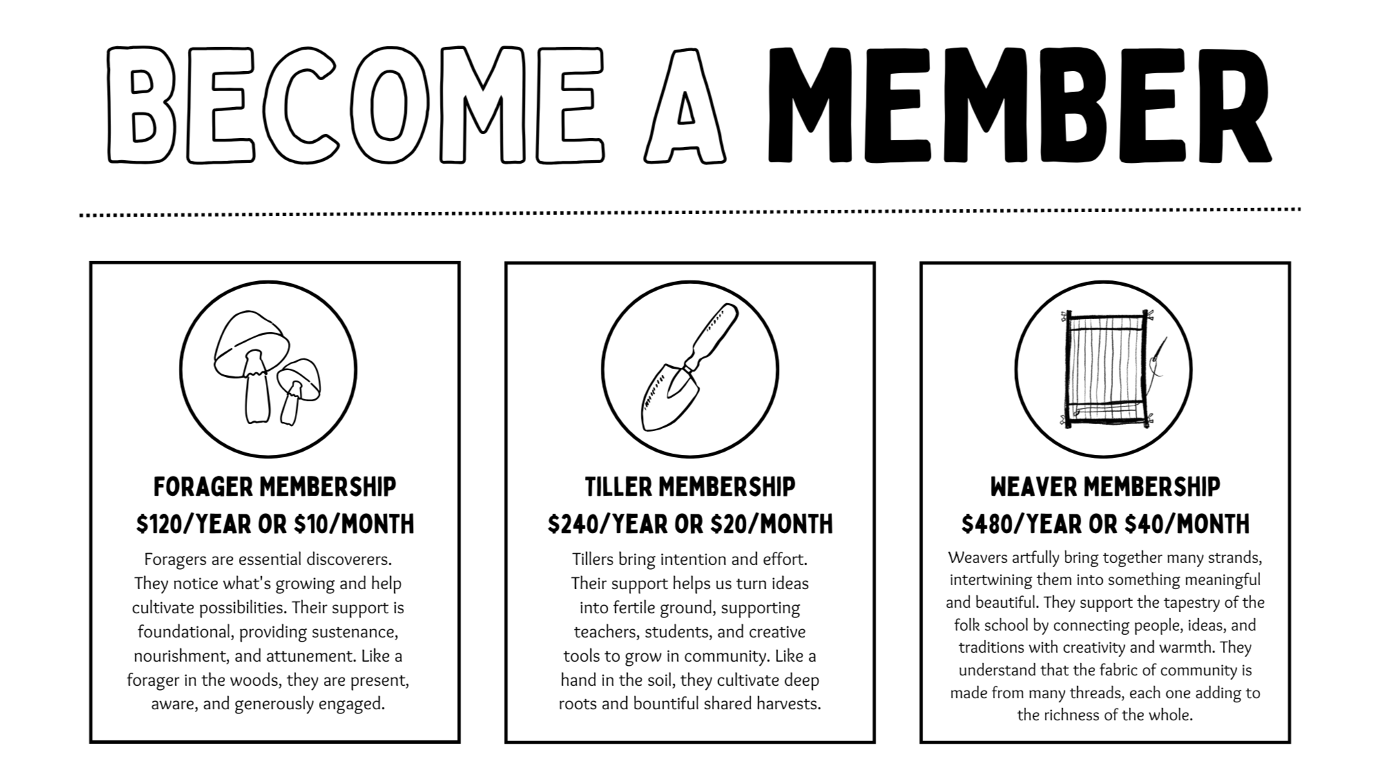 The Driftless Folk School Membership program invites you to support and grow a vibrant learning community rooted in traditional skills, creativity, and connection. With three tiers, Forager, Tiller, and Weaver, members can choose a level of involvement that fits their means and interest. All members enjoy meaningful perks like access to Field Notes, our members-only newsletter, opportunities to connect through Office Hours with skilled instructors, and an invitation to our annual First Fruits banquet, where we enjoy farm-to-table cuisine in community. However you join, your membership helps sustain the shared harvest of knowledge, craft, and community that defines Driftless Folk School.