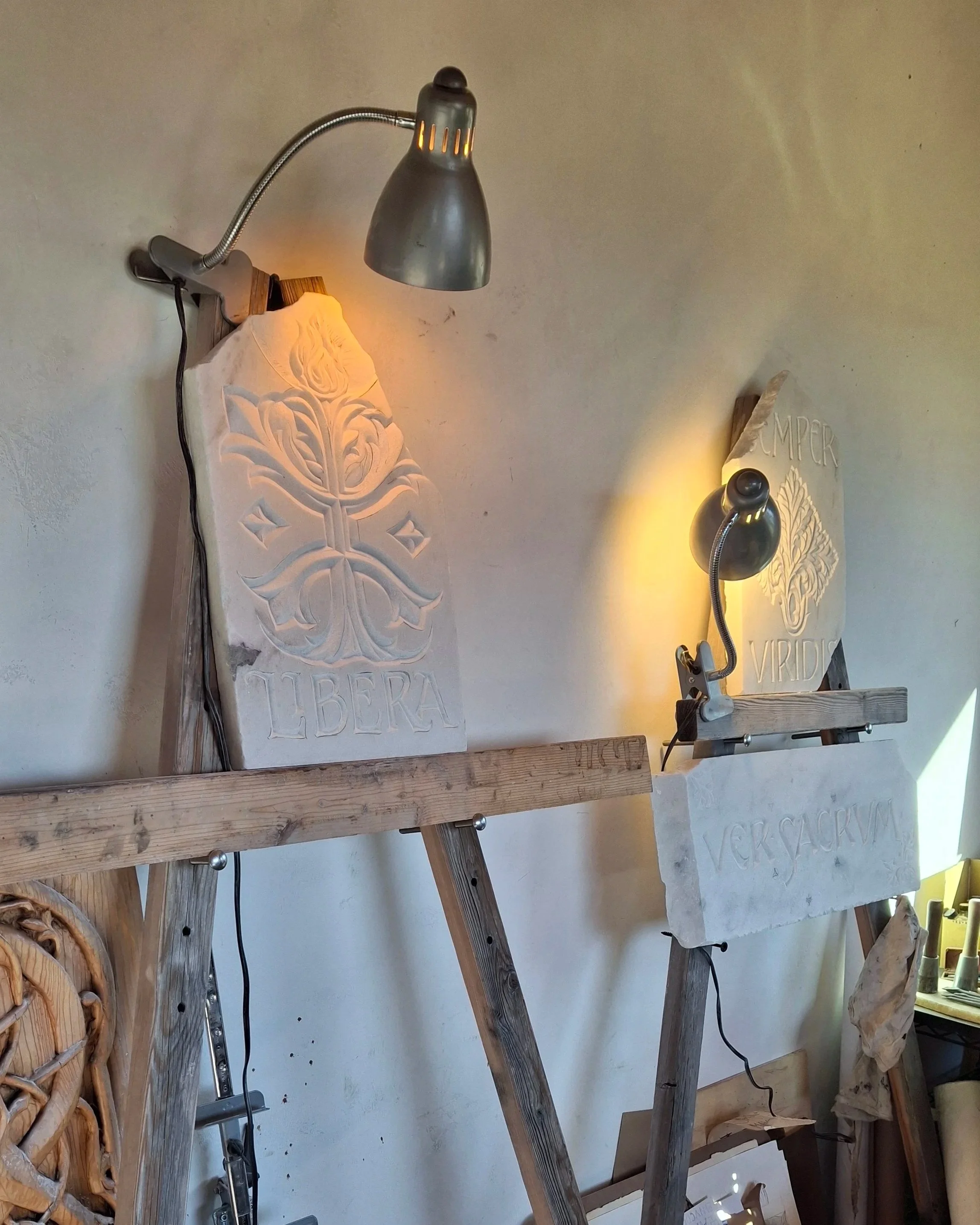 Students will carve at least one letter, word, monogram or symbol in stone, either Colorado Marble or East Coast Slate, approximately 6-8” in size. The scope of each student’s projects may vary, expanding to encompass words, names, phrases or decorative patterns, depending on the pace and skill level of each individual. Preparatory sketches will include at least one finished drawing of a letterform suitable for carving, with indications of the beveled cuts that bring handmade carvings to life though changing natural lighting conditions.