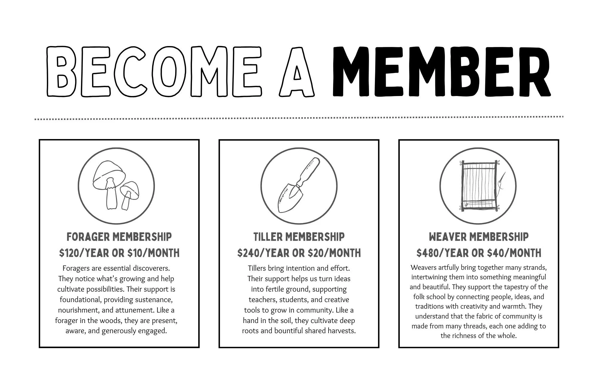 The Driftless Folk School Membership program invites you to support and grow a vibrant learning community rooted in traditional skills, creativity, and connection. With three tiers, Forager, Tiller, and Weaver, members can choose a level of involvement that fits their means and interest. All members enjoy meaningful perks like access to Field Notes, our members-only newsletter, opportunities to connect through Office Hours with skilled instructors, and an invitation to our annual First Fruits banquet, where we enjoy farm-to-table cuisine in community. However you join, your membership helps sustain the shared harvest of knowledge, craft, and community that defines Driftless Folk School.